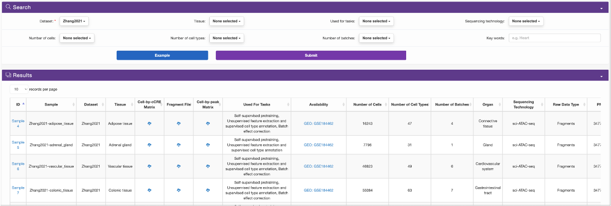 Users can search for scATAC-seq data (sample) of interest by selecting Dataset, Tissue, Organ, Used for task, Sequencing technology, the ranges of cell counts, cell types, and batches. We also provide an example to facilitate the usage of searching.