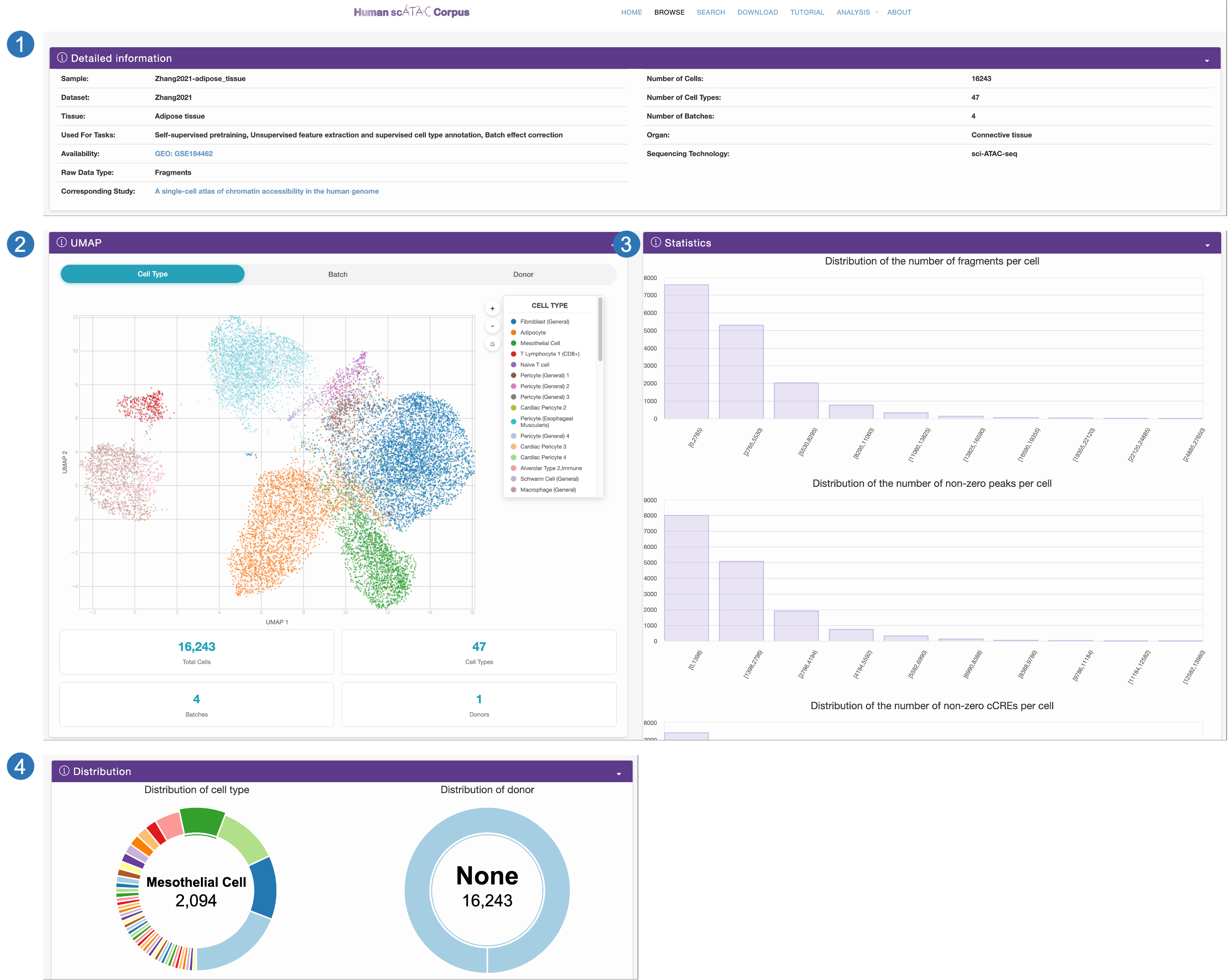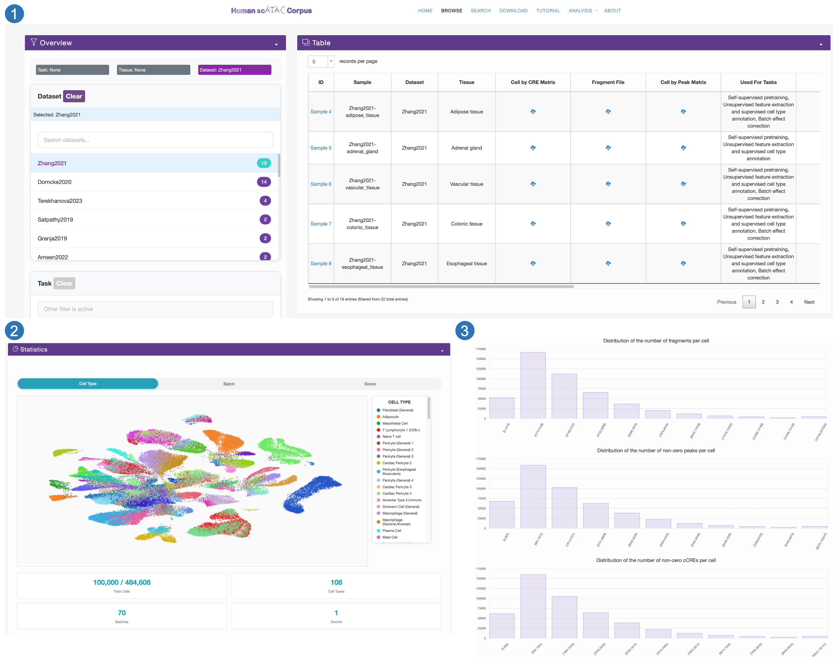 We also categorize these samples by tissue and dataset, and provide users with downloadable files including the cell-by-cCRE matrix fragment file, the cell-by-peak matrix, and metadata.