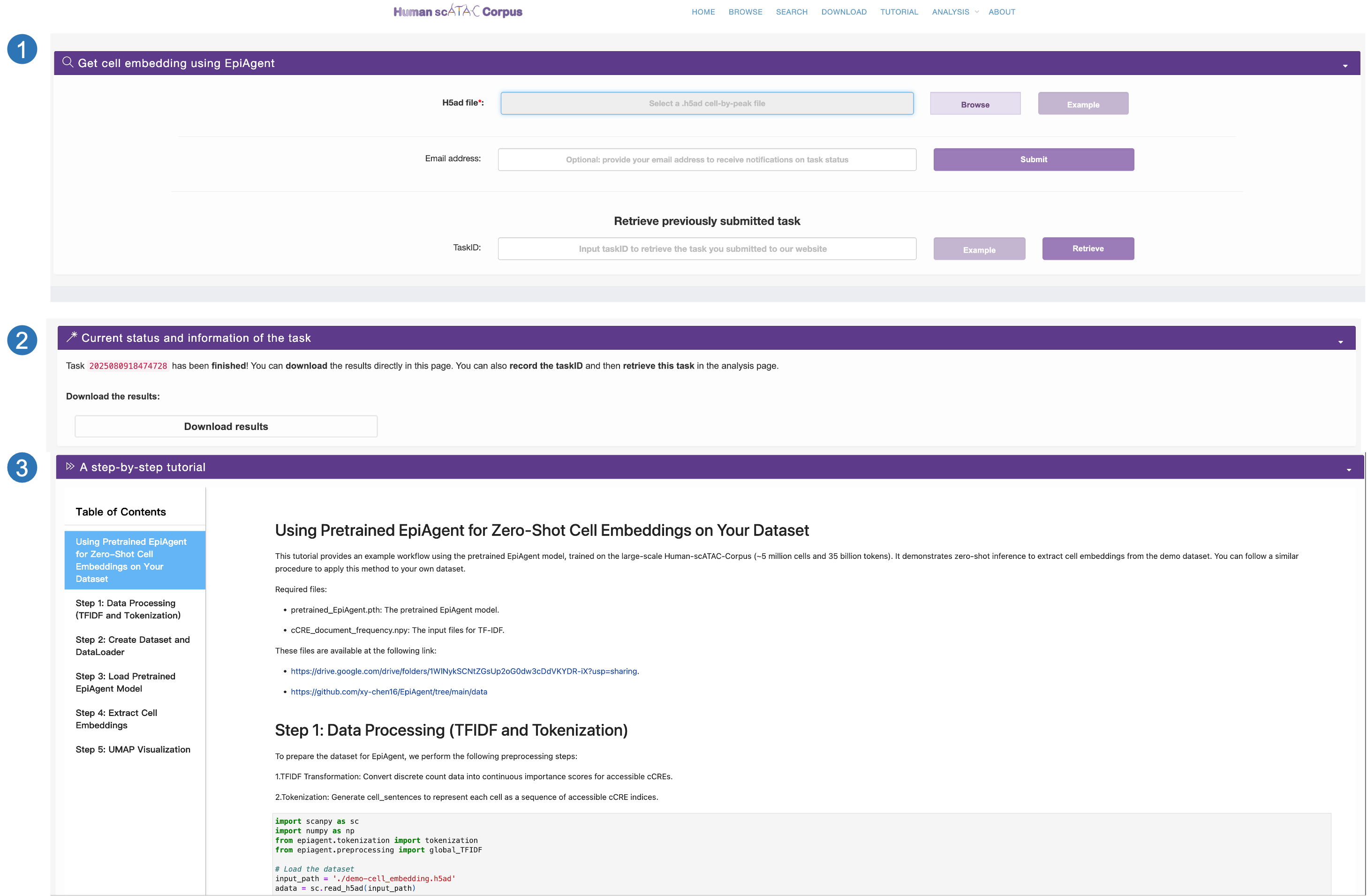 Taking cell embedding as an example, users are required to first select and upload their own cell-by-cCRE file and may optionally provide their email address to avoid prolonged waiting times. Upon submission, users will receive a unique task ID for subsequent tracking. Users can click the Example button to download a sample file.