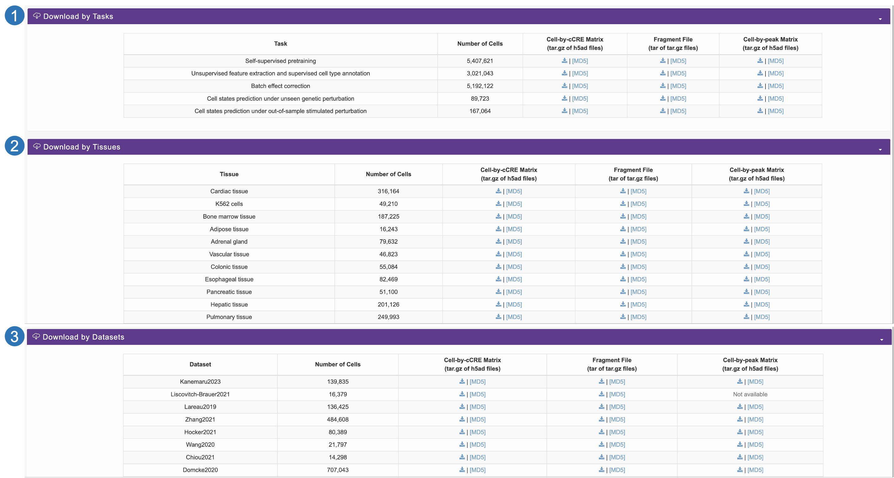 We categorize these samples by task and provide users with downloadable files including the cell-by-cCRE matrix fragment file, the cell-by-peak matrix, and metadata.